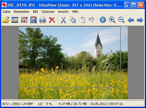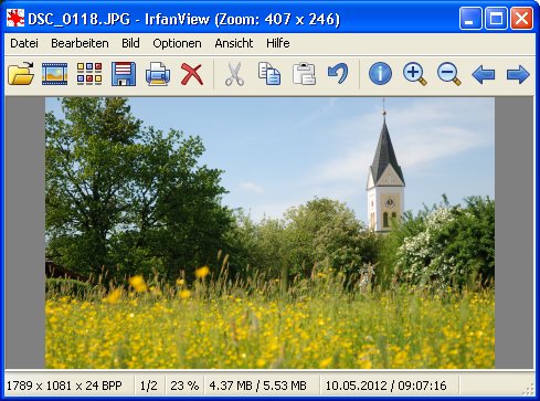 Von diesem Foto soll eine Kopie in einer bestimmten Pixelgröße erstellt werden. Die genaue Größe orientiert sich in diesem Beispiel an den Anforderungen für einen Kalender, der über den Dienstleister www.meinbildkalender.de erstellt werden soll. Die gewünschte Größe sei 1789 Pixel breit und 1081 Pixel hoch bei einer Auflösung von 150 ppi. Ich lade das Bild in Irfanview.